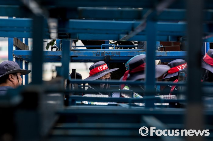 (아산=포커스뉴스) 1일 오후 충남 아산 탕정면 갑을오토텍에서 노조원들과 사측 경비 용역들이 대치하고 있다.