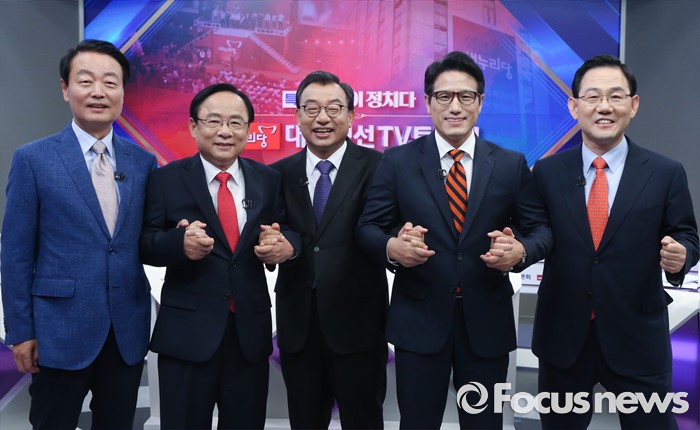 (서울=포커스뉴스) 1일 오후 서울 중구 TV조선 스튜디오에서 새누리당 대표 경선 TV토론회에 앞서 의원들이 포즈를 취하고 있다. 왼쪽부터 한선교, 이주영, 이정현, 정병국, 주호영 의원.