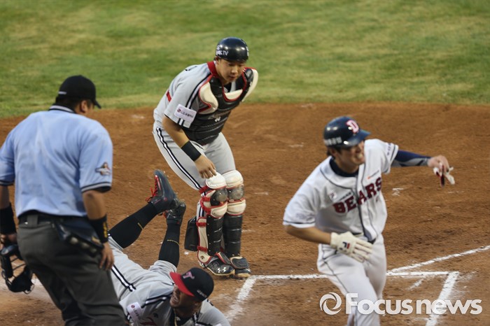 (서울=포커스뉴스) 2일 오후 서울 잠실구장에서 열린 2016 프로야구 LG-두산 경기 3회말 1사 2루 상황, 김재호가 히메네스의 런다운을 피해 홈 베이스로 질주하고 있다.