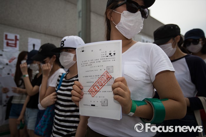 (서울=포커스뉴스) 미래라이프 대학 설립에 반대하는 이화여대 졸업생들 및 재학생들이 2일 오후 서울 서대문구 이화여자대학교 정문 앞에서 졸업장 반납 시위를 하고 있다.
