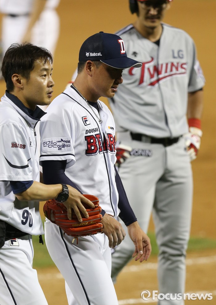 (서울=포커스뉴스) 3일 서울 잠실구장에서 열린 2016 프로야구 LG-두산 경기 8회초 2사 1,2루에서 두산 투수 정재훈이 LG 박용택의 타구에 맞고 마운드를 내려가고 있다. 박용택이 걱정스런 표정으로 바라보고 있다.