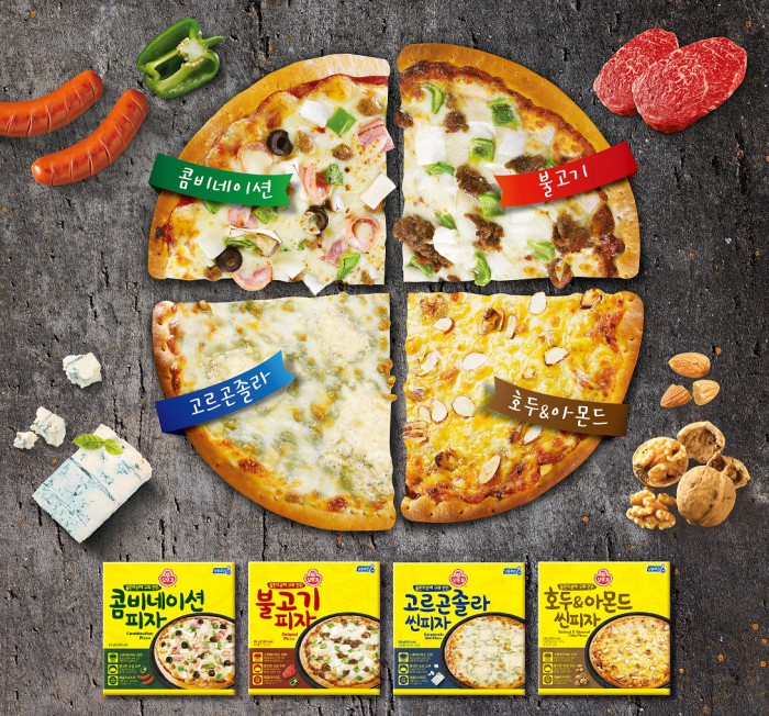 신제품 오뚜기 피자는 '콤비네이션 피자' '불고기피자' '고르곤졸라 씬피자' '호두&아몬드 씬피자' 4종으로 출시됐다. 이들 신제품은 정통 피자의 맛을 집에서도 간편하게 즐길 수 있는 가정 간편식 냉동제품이다.