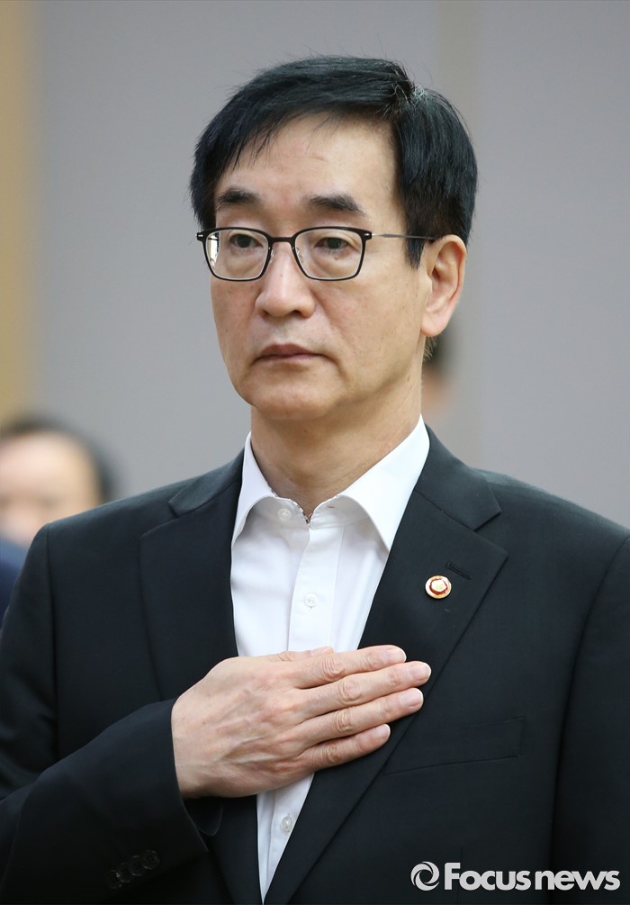 (세종=포커스뉴스) 2일 오전 세종시 정부세종청사 국무회의장에서 열린 청와대-세종 영상 국무회의에서 이준식 사회부총리 겸 교육부장관이 국기에 대한 경례를 하고 있다.