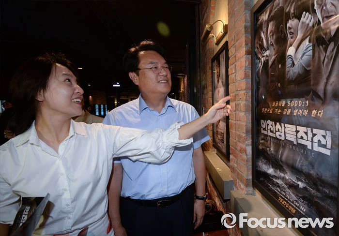 (서울=포커스뉴스) 정진석(오른쪽) 새누리당 원내대표와 임윤선 혁신비대위원이 1일 오후 서울 여의도 한 영화관에서 영화 '인천상륙작전' 관람에 앞서 대화하고 있다.