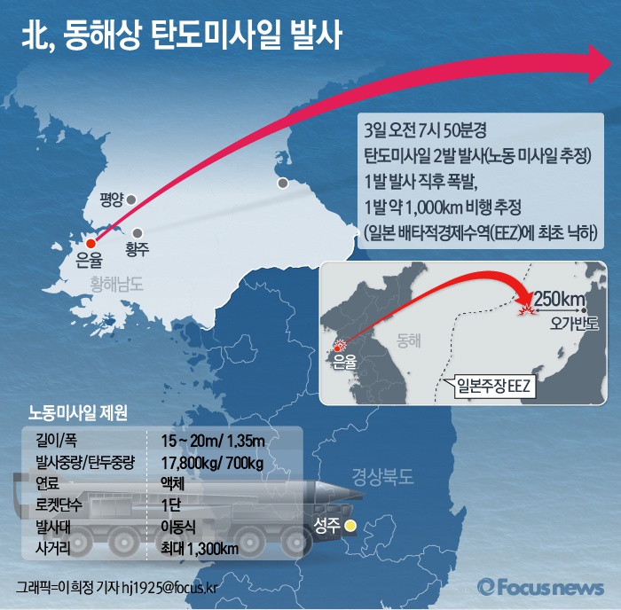 (서울=포커스뉴스) 북한이 3일 오전 노동미사일 두 발을 발사한 가운데 미국과 일본의 요구로 유엔 안전보장이사회가 긴급회의를 소집했다고 미국 USA 투데이가 보도했다.