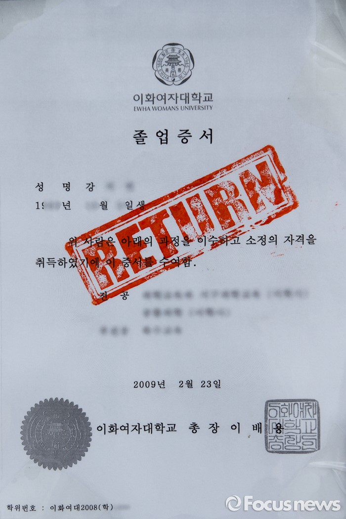 (서울=포커스뉴스) 미래라이프 대학 설립에 반대하는 학생측이 엿새째 이화여대 본관을 점거하고 있는 2일 오전 서울 서대문구 이화여대 정문 앞에 졸업장 복사본이 부착돼 있다.