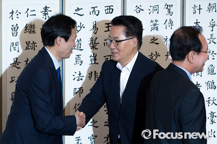 (서울=포커스뉴스) 박지원(가운데) 국민의당 원내대표와 우상호(왼쪽) 더불어민주당 원내대표가 3일 오전 서울 여의도 국회에서 열린 원내대표 회동에 참석해 악수 하고 있다.