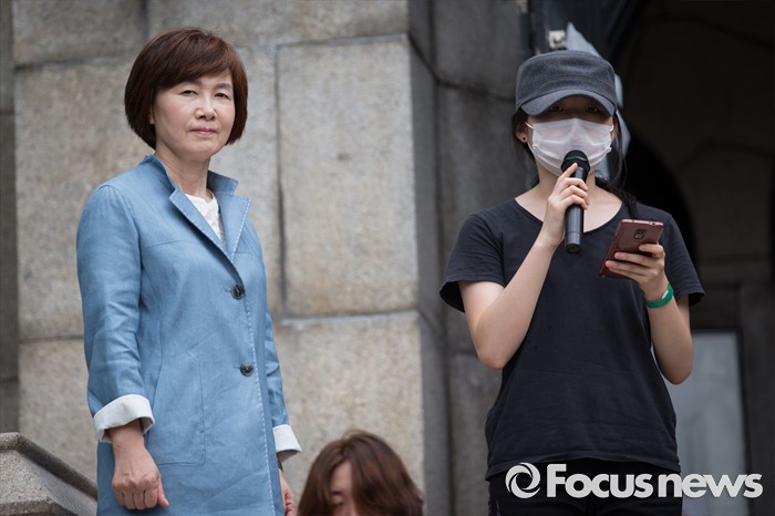 (서울=포커스뉴스) 최경희(왼쪽) 이화여자대학교 총장이 3일 오후 서울 서대문구 이화여대 본관에서 평생교육 단과대학인 '미래라이프대학' 설립 중단 발표를 마친 뒤, 학생들의 발언을 듣고 있다.