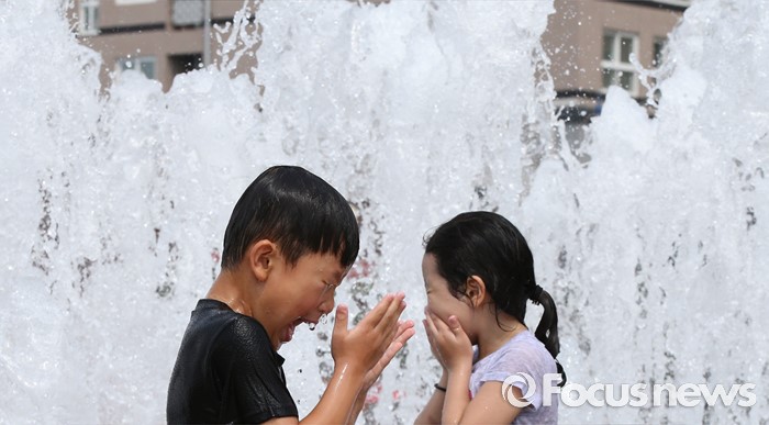 (청주=포커스뉴스) 전국 대부분 지역에 폭염특보가 내려진 1일 오후 충북 청주 오송호수공원 분수대에서 어린이들이 더위를 식히고 있다.