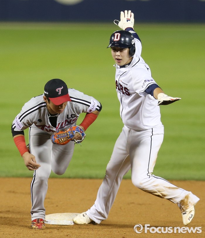 (서울=포커스뉴스) 3일 서울 잠실구장에서 열린 2016 프로야구 LG-두산 경기 6회말 1사후 볼넷으로 진루한 두산 1루주자 박건우가 류지혁 타석때 2루 도루를 시도해 세이프되고 있다.