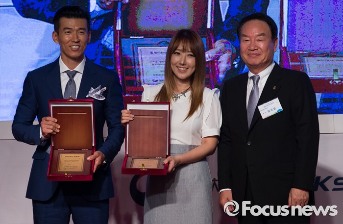 (서울=포커스뉴스) 2일 오후 서울 송파구 올림픽파크텔에서 열린 2016 리우 패럴림픽 대한민국 선수단 결단식에 참석한 가수 션(왼쪽)과 BJ 디바 제시카가 기념촬영 하고 있다. 오른쪽은 김성일 대한장애인체육회 회장.
