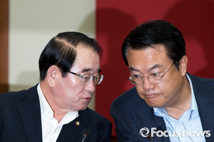 (서울=포커스뉴스) 정진석(오른쪽) 새누리당 원내대표와 박명재 사무총장이 4일 오전 서울 여의도 새누리당사에서 열린 혁신비상대책위원회의에 참석해 대화하고 있다.
