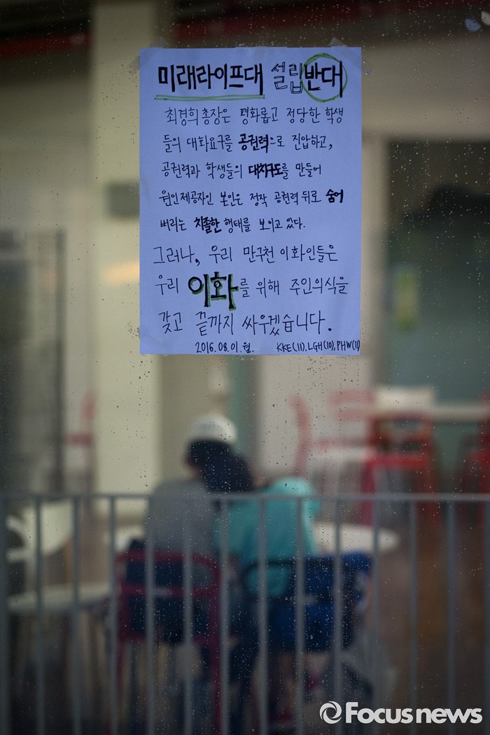 (서울=포커스뉴스) 미래라이프 대학 설립에 반대하는 학생들이 엿새째 이화여대 본관을 점거하고 있는 2일 밤, 서울 서대문구 이화여대 교내에 다양한 목소리의 시위성 글들이 붙어 있다.