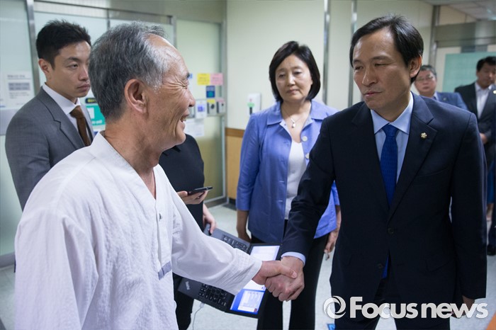 (서울=포커스뉴스) 우상호(오른쪽) 더불어민주당 원내대표와 박영선(가운데) 의원이 3일 오후 종로구 서울대학교병원을 찾아 지난해 민중총궐기 당시 경찰의 물대포를 맞고 입원 중인 백남기 농민을 위로 방문한 뒤 정현찬 백남기대책위 공동대표를 격려하고 있다.