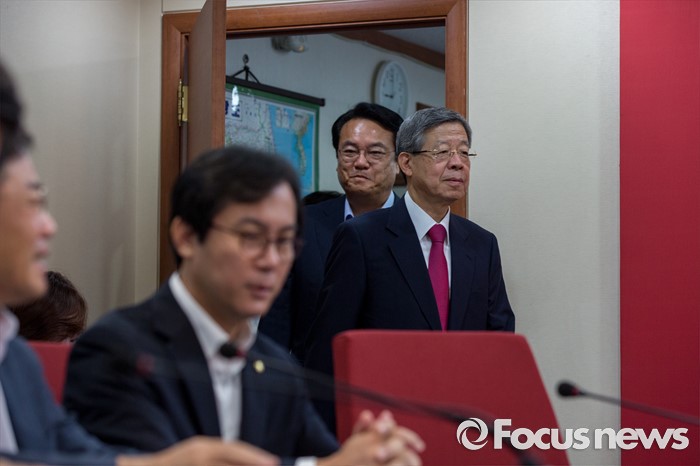 (서울=포커스뉴스) 김희옥(오른쪽) 새누리당 혁신비상대책위원장과 정진석 원내대표가 1일 오전 서울 여의도 새누리당사에서 열린 혁신비상대책위원회의에 참석하기 위해 회의실로 들어서고 있다.