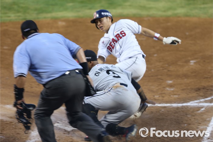 (서울=포커스뉴스) 2일 오후 서울 잠실구장에서 열린 2016 프로야구 LG-두산 경기 3회말 1사 만루 상황, LG 투수 허프의 폭투로 3루 주자 정수빈이 홈으로 진루해 세이프 하고 있다.