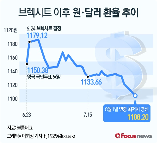 1일 서울 외환시장에서 원·달러 환율은 전 거래일보다 12.2원(1.09%)하락(원화 가치 상승)한 1108.0원으로 거래를 마쳤다. 이는 연중 최저치였던 7월 29일 종가(1120.2원)보다 더 하락한 금액이다. 2015년과 비교해보면 5월 29일 종가(1108.2원) 수준이다.