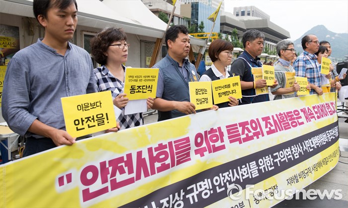 (서울=포커스뉴스) 2일 오전 서울 종로구 광화문광장에서 지하철 비정규직 사망재해 해결과 안전사회를 위한 시민대책위원회가 세월호 특조위 동조단식 돌입 기자회견을 하고 있다.