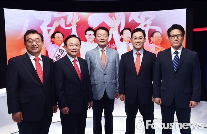 (서울=포커스뉴스) 2일 오후 서울 상암동 MBC 스튜디오에서 열린 '새누리당 대표 경선 TV토론회'에 참석한 의원들이 포즈를 취하고 있다. 왼쪽부터 이정현, 이주영, 한선교, 주호영, 정병국 의원.