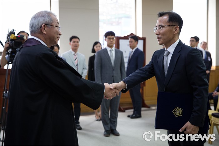(서울=포커스뉴스) 1일 오전 서울 서초동 대법원에서 열린 신임 법관 임명식에서 양승태 대법원장이 신임 법관에게 임명장을 수여한 후 인사를 나누고 있다.