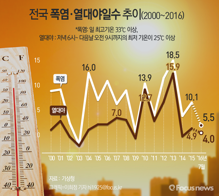 [그래픽] 전국 폭염·열대야일수 추이(2000~2016)