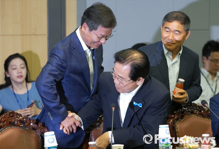 (서울=포커스뉴스) 2일 오전 서울 여의도 국회 의원회관에서 열린 국민의당 의원총회에 참석한 천정배(왼쪽) 전 공동대표와 박준영(가운데) 의원이 인사하고 있다. 검찰은 수억 원대 공천헌금을 수수한 혐의로 박준영 의원에 대해 구속영장을 재청구했지만 기각됐다.