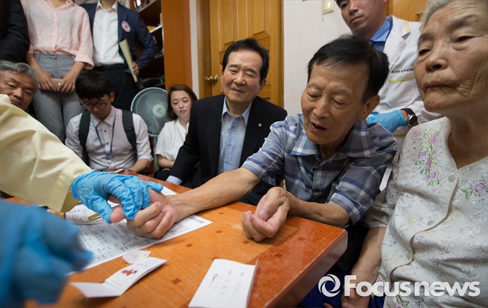 (서울=포커스뉴스) 정세균 국회의장이 2일 오전 서울 종로구 창신동에 거주하고 있는 고령 이산가족 김문각 할아버지(84세, 평안남도 양덕군 청계리) 가정을 방문해 이산가족 상봉 준비를 위한 김 할아버지의 혈액 채취 과정을 지켜보고 있다.