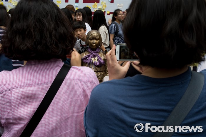 (서울=포커스뉴스) 3일 오후 서울 종로구 구 일본대사관 앞에서 열린 '제1242차 일본군 위안부 문제해결을 위한 정기 수요집회'에 참석한 시민들이 소녀상 사진을 찍고 있다.