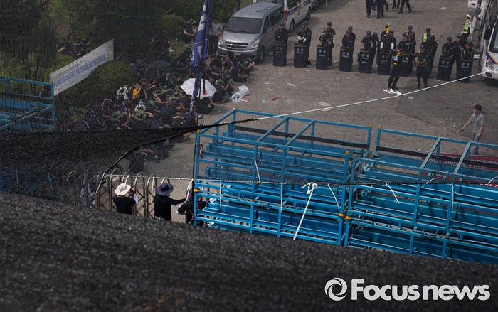 (아산=포커스뉴스) 1일 오전 충남 아산 탕정면 갑을오토텍에서 노조원들이 사측의 경비 용역 투입에 대비하고 있다.