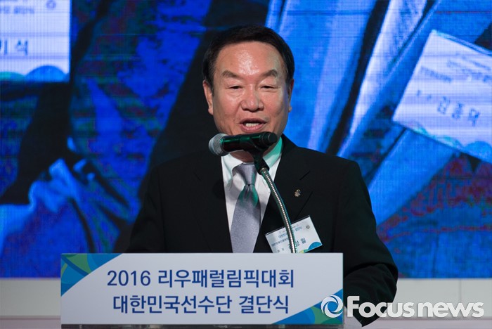 (서울=포커스뉴스) 2일 오후 서울 송파구 올림픽파크텔에서 열린 2016 리우 패럴림픽 대한민국 선수단 결단식에 참석한 김성일 대한장애인체육회 회장이 격려사를 하고 있다.