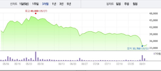 YG엔터는 4일 오전 9시34분 현재 전거래일 대비 1.62%(550원) 상승한 3만4400원에 거래되고 있다. YG엔터는 7월29일부터 이달 3일까지 1~8%의 낙폭을 기록했다.