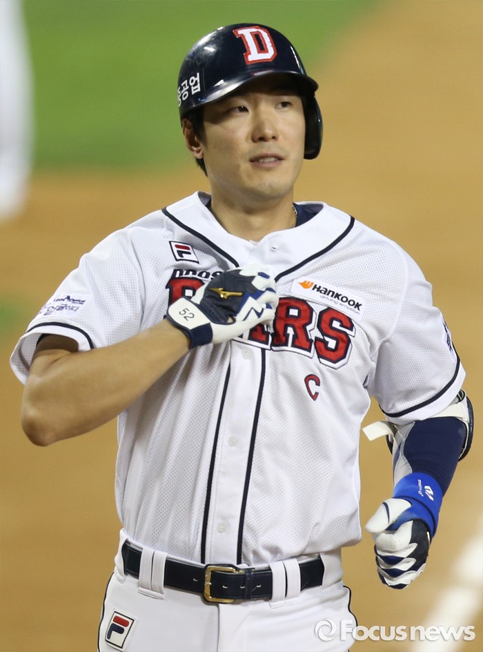 (서울=포커스뉴스) 3일 서울 잠실구장에서 열린 2016 프로야구 LG-두산 경기 6회말 두산 김재호가 좌월 솔로 홈런을 치고 홈인하고 있다.