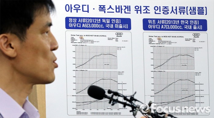 (세종=포커스뉴스) 홍동곤 환경부 교통환경과장이 2일 오전 세종시 정부세종청사 환경부 기자실에서 위조서류로 불법인증을 받은 폭스바겐 32개 차종(80개 모델)에 대해 인증취소 처분을 내렸다고 밝히고 있다.