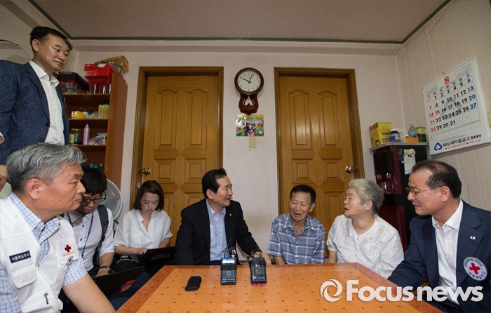 (서울=포커스뉴스) 정세균 국회의장이 2일 오전 서울 종로구 창신동에 거주하고 있는 고령 이산가족 김문각 할아버지(84세, 평안남도 양덕군 청계리), 이오례 할머니 부부와 만나 대화하고 있다.