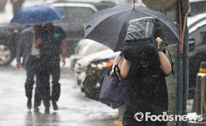 (서울=포커스뉴스) 천둥, 번개를 동반한 강한비가 내린 2일 오후 서울 서초구 교대역 주변에서 시민들이 비를 피해 발걸음을 재촉하고 있다.