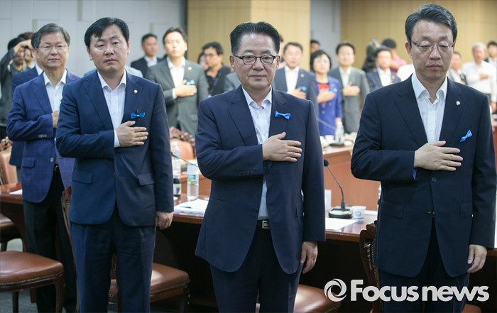 (서울=포커스뉴스) 2일 오전 서울 여의도 국회 의원회관에서 열린 국민의당 의원총회에 참석한 김성식(앞줄 오른쪽부터) 정책위의장, 박지원 비상대책위원장, 김관영 원내수석부대표, 천정배 전 공동대표 등 의원들이 국기에 대한 경례를 하고 있다.
