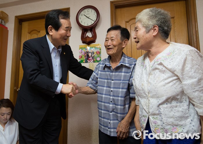 (서울=포커스뉴스) 정세균 국회의장이 2일 오전 서울 종로구 창신동에 거주하고 있는 고령 이산가족 김문각 할아버지(84세, 평안남도 양덕군 청계리) 가정을 방문해 김 할아버지와 인사하고 있다. 오른쪽은 아내 이오례 할머니.