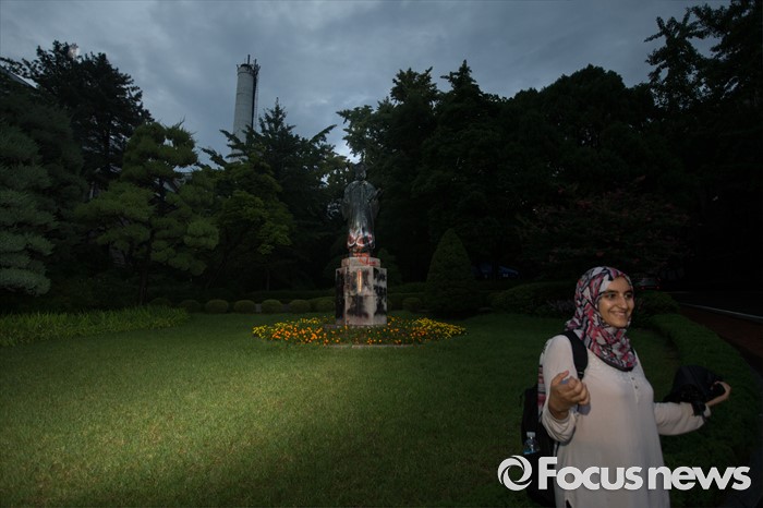(서울=포커스뉴스) 2일 저녁 서울 서대문구 이화여대에서 한 외국인이 페인트 칠과 계란 투척으로 얼룩진 김활란 초대 총장 동상 앞에서 기념 사진을 찍고 있다. 이화여자대학교는 미래라이프 대학(평생교육 단과대학 지원사업)' 설립을 두고 학내 분규가 이어지고 있으며 단과대학 지원사업을 반대하는 학생들이 지난 28일부터 6일째 이대 본관을 점거해 농성하고 있다.