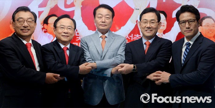 (서울=포커스뉴스) 2일 오후 서울 상암동 MBC 스튜디오에서 열린 '새누리당 대표 경선 TV토론회'에 참석한 의원들이 포즈를 취하고 있다. 왼쪽부터 이정현, 이주영, 한선교, 주호영, 정병국 의원.