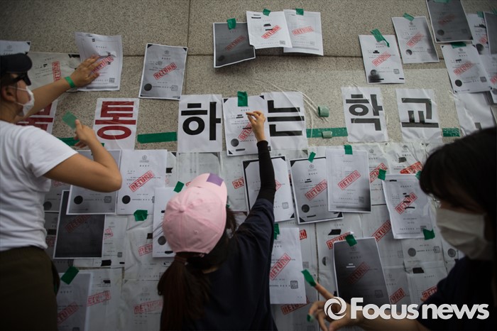 (서울=포커스뉴스) 미래라이프 대학 설립에 반대하는 이화여대 졸업생들 및 재학생들이 2일 오후 서울 서대문구 이화여자대학교 정문 앞에서 졸업장 반납 시위를 하고 있다.