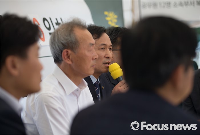 (서울=포커스뉴스) 1일 오전 서울 종로구 광화문 광장에서 이석태 세월호 참사 특별위원장의 단식농성장을 방문한 우상호 더불어민주당 원내대표가 격려 발언을 하고 있다.