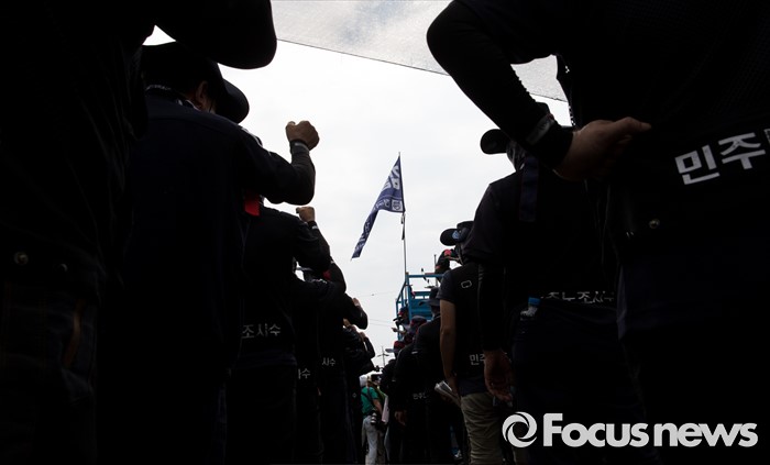 (아산=포커스뉴스) 1일 오후 충남 아산 탕정면 갑을오토텍에서 노조원들이 사측 경비 용역 진입을 반대하며 구호를 외치고 있다.