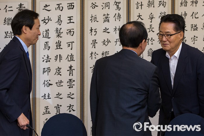 (서울=포커스뉴스) 박지원(오른쪽) 국민의당 원내대표와 노회찬 정의당 원내대표가 3일 오전 서울 여의도 국회에서 열린 원내대표 회동에 참석해 악수 하고 있다.