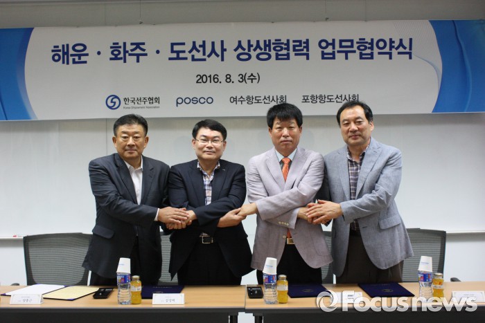 한국선주협회와 포스코, 여수항·포항항도선사회는 이날 서울 여의도 해운빌딩 회의실에서 '해운ㆍ화주ㆍ도선사 상생협력을 위한 업무협약'을 체결하고 협력관계를 더욱 확대해 나가기로 합의했다.