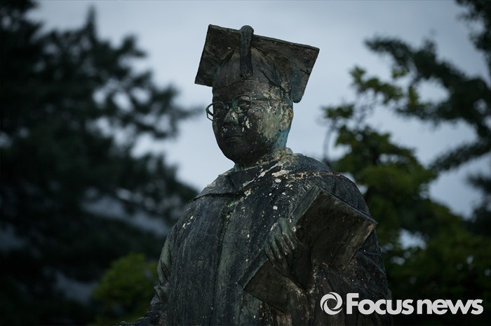 (서울=포커스뉴스) 이화여대 미래라이프 대학 설립 문제로 학교와 학생들이 갈등을 빚고 있는 2일 밤, 서울 서대문구 이화여대 본관 인근에 김활란 초대 총장의 동상이 페인트와 계란으로 얼룩져있다.