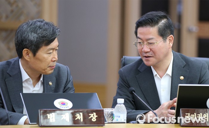 (세종=포커스뉴스) 2일 오전 세종시 정부세종청사 국무회의장에서 열린 청와대-세종 영상 국무회의에서 성영훈(오른쪽) 국민권익위원장이 제정부 법제처장과 대화하고 있다.