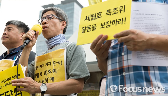 (서울=포커스뉴스) 2일 오전 서울 종로구 광화문광장에서 지하철 비정규직 사망재해 해결과 안전사회를 위한 시민대책위원회가 세월호 특조위 동조단식 돌입 기자회견을 하고 있다.