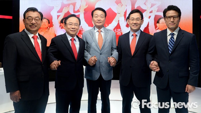 (서울=포커스뉴스) 2일 오후 서울 상암동 MBC 스튜디오에서 열린 '새누리당 대표 경선 TV토론회'에 참석한 의원들이 포즈를 취하고 있다. 왼쪽부터 이정현, 이주영, 한선교, 주호영, 정병국 의원.