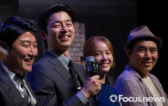 (서울=포커스뉴스) 4일 오전 서울 강남구 압구정 CGV에서 열린 영화 '밀정' 제작보고회에 참석한 배우 송강호(왼쪽부터), 공유, 한지민, 김지운 감독이 밝게 웃고 있다. 배우 송강호, 공유, 한지민, 엄태구, 신성록 등이 출연하는 영화 '밀정'은 일제 강점기 무장독립단체 의열단과 일본 경찰 간의 암투를 그린 작품으로 오는 9월 개봉 예정이다.