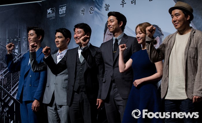(서울=포커스뉴스) 배우 신성록(왼쪽부터), 엄태구, 송강호, 공유, 한지민, 김지운 감독이 4일 오전 서울 강남구 압구정 CGV에서 열린 영화 '밀정' 제작보고회에 참석해 포즈를 취하고 있다. 배우 송강호, 공유, 한지민, 엄태구, 신성록 등이 출연하는 영화 '밀정'은 일제 강점기 무장독립단체 의열단과 일본 경찰 간의 암투를 그린 작품으로 오는 9월 개봉 예정이다.
